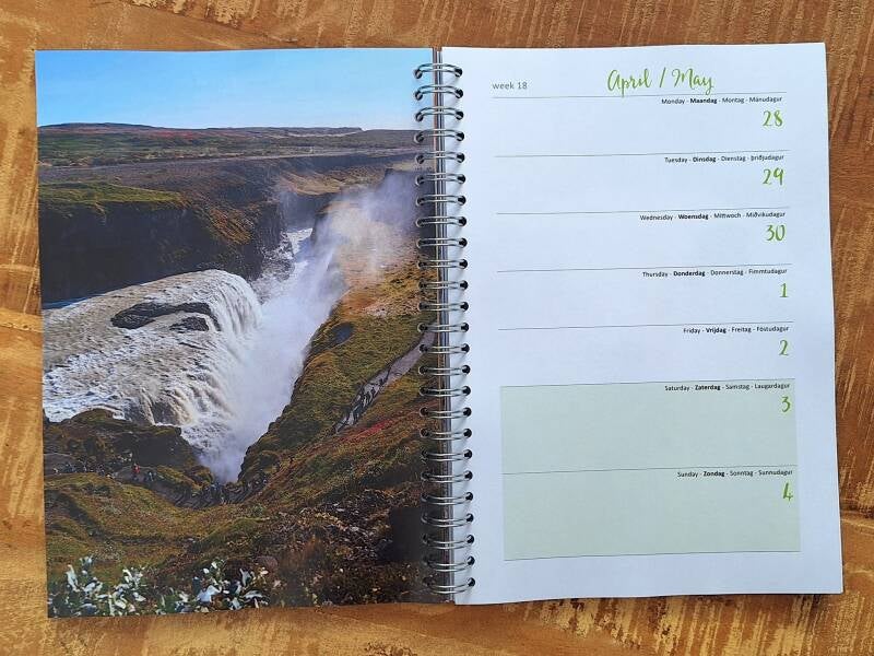The agenda has a sturdy, double cover front and back and is equipped with sturdy, transparent protective sheets. Ring band color is silver gray. The agenda contains more than 148 pages with a beautiful photo every week. There are also various spreads (photos over 2 pages) in the agenda.